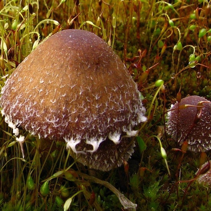 Vaisiakūniai nedideli. Kepurėlė 1,5-4 cm skersmens, iš pradžių - kūgiška, varpeliška, dribsniuotai plaušuota, vėliau — iškiliai paplokščia, nešvariai pilkai ruda, išblunkanti iki pilkai gelsvos, baltai plaušuota. Lakšteliai pilkšvi, seni - purpuriškai rudi, pakraštėliai balsvi. Kotas 2-5 (7)x0,2—0,5 cm, baltas, baltai plaušuotas. Trama balsva, be kvapo ir skonio.