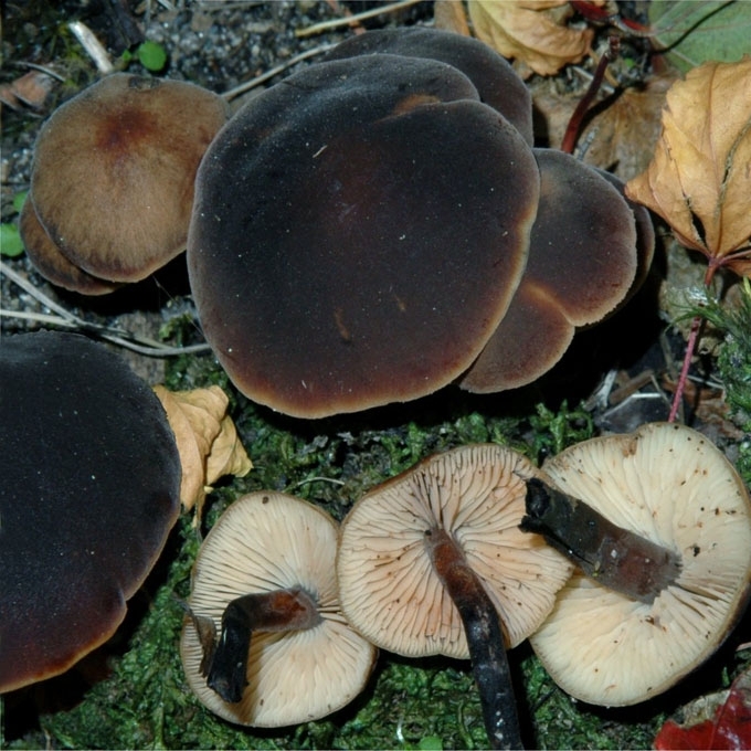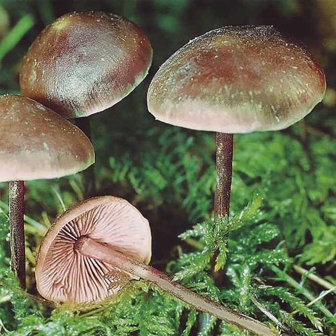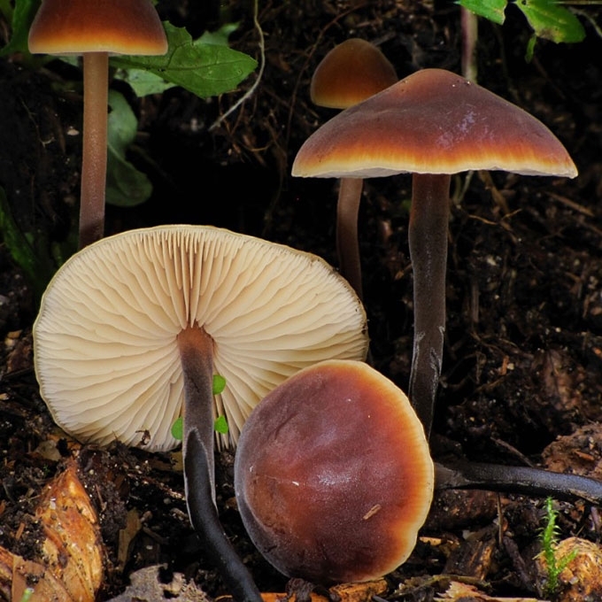 Vaisiakūniai maži. Kepurėlė 2-5 cm skersmens, jauna - kūgio, vėliau - varpelio formos, giliausiai - iškiliai paplokščia, su gūbreliu, higrofaninė, matinė, kaštoninė, tamsiai ruda, išblunkanti, pakraščiai šviesesni, vos vagoti. Lakšteliai tankūs, siauri, pilkšvi, vėliau - rausvai gelsvi, priaugtiniai. Kotas 3-7x0,3-0,7 cm, tiesus, į pamatą smailėjantis, šiek tiek aksomiškas, rusvai juodas, prie lakštelių šviesesnis. Trama plona, tampri, nekarti, agurko ar žuvų kvapo. Cistidės didelės, nusmailėjusios, 55-90x15-20 pm.