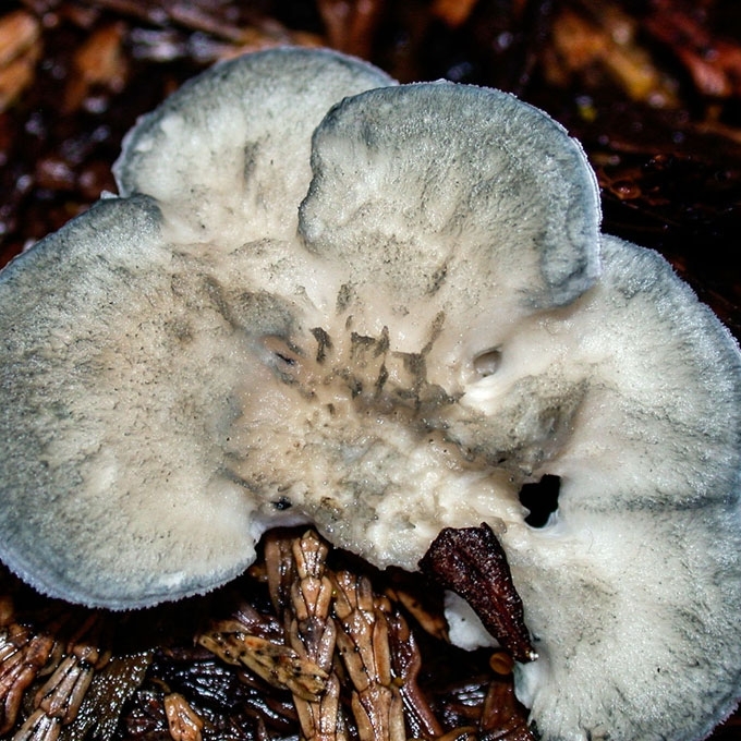 Vaisiakūniai vienmečiai. Kepurėlės pusiau apskritos, 2-7 cm pločio, 1-5 cm skersmens ir iki 1 cm storio, auga pavieniui arba grupelėmis - po kelias, viena virš kitos. Paviršius šiurkštus, plaukuotas, raukšlėtai gauruotas, neryškiai rievėtas, baltas, pilkas, greitai tampa nešvariai žalsvai juosvai mėlynas. Apatinė pusė balta, balkšva ar kreminė, poros smulkutės, greitai patamsėja, paspaudus iš karto pamelsvėja. Trama minkšta, balta, melsvėjanti.