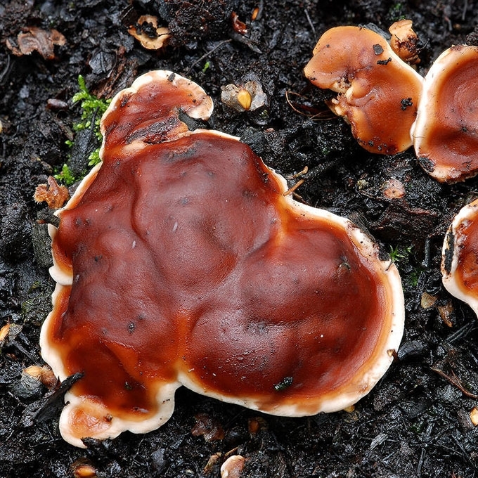 Keisti, bekočiai vaisiakūniai, 3-10 (13) cm dydžio, jauni - lyg kūgiški gūbreliai, vėliau išsiplečia, išsidriekia, banguotai kauburiuoti, rausvai rudi, rudi, šokolado spalvos ar net rudai juodi. Vietoje koto tik sustorėję grybienos laidai ar rizoidai, lyg šaknys įsiskverbę į substratą. Trama gelsva, be kvapo ir skonio.