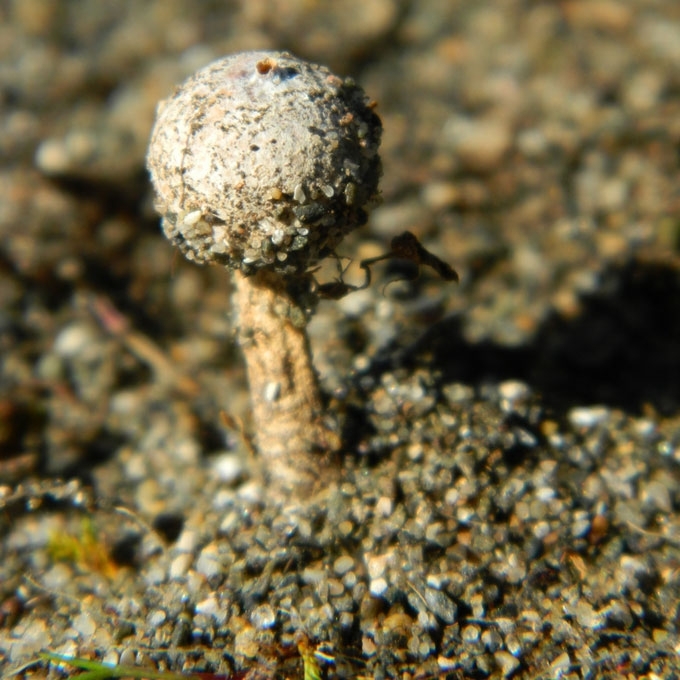 Vaisiakūniai smulkūs. Jauni - rutuliški, subrendę - 3-6 cm aukščio. Galvutė 0,5-1 (1,5) cm skersmens, apvali ar suplota, kartais svogūniška, su angele viršuje, šviesiai rudos, ochrinės, rudos, smėlio spalvos. Kotas 1,5-6 cm ilgio ir 0,2-0,3 cm storio, plaušuotas, žvyneliuotas, pasišerpetojęs, tuščiaviduris, kepurėlės spalvos, ties pamatu su gumbeliu.