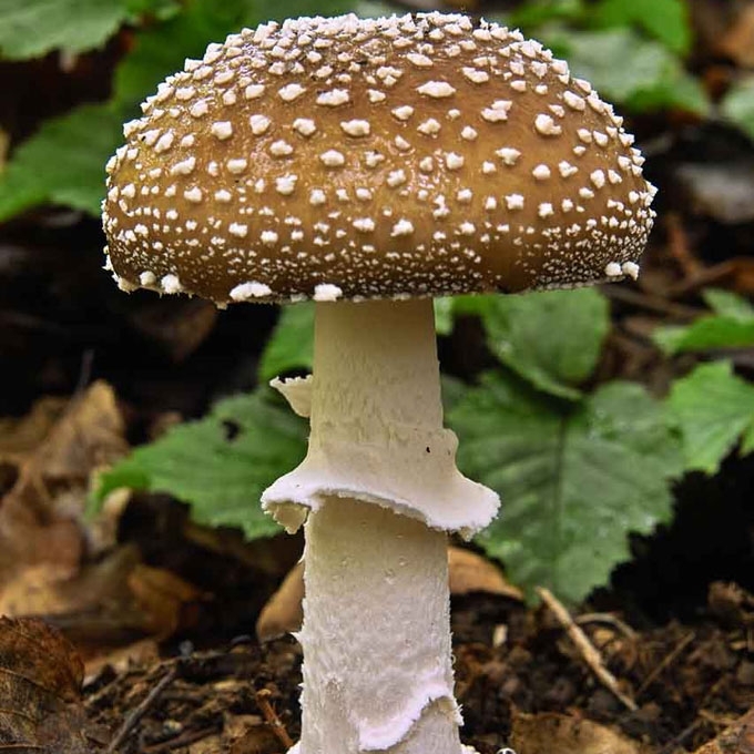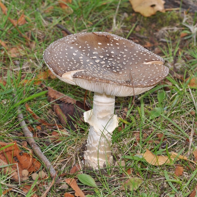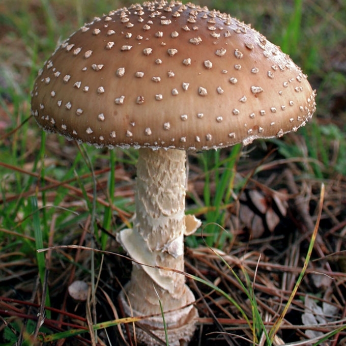 Vaisiakūniai dideli. Kepurėlė 5-10 (12) cm skersmens, pusiau apvali, galiausiai pana, šviesiai ruda, pilkai ruda, gelsvai ruda, paviršius apšepęs nedideliais baltais žvyneliais, karputėmis. Lakšteliai balti, tankūs, platūs, laisvi. Kotas 7-12x1-2 cm, baltas, plaušuotas, tarsi dribsniuotas, su žiedu, į apačią nežymiai storėjantis, pamatinė dalis gumbiškai sustorėjusi, apgaubta tvirtai priaugusia balta, tarsi pašiurpusia išnara, virš kurios dar driekiasi 1-3 gležni plaušingi žiediški fragmentai. Trama balta, nemalonaus kvapo.