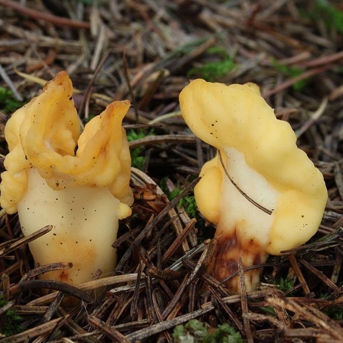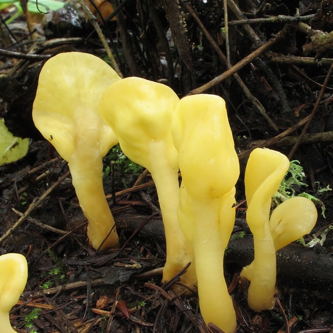 Pagr. požymiai: Vaisiakūniai buki, oranžiškai geltoni, kastuvėlio formos