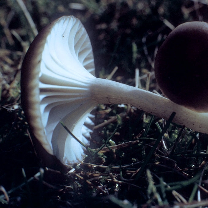 Vaisiakūniai smulkūs. Kepurėlė 1,5-3 cm skersmens, matinė, plaušuota, kartais koncentriškai zonuota, violetiškai pilka, juosvai pilka ar net pilkai ruda. Lakšteliai balti, labai tankūs, siauri, rausvai dėmėti, nuaugtiniai. Kotas 3-9x0,3—0,7 cm, kepurėlės spalvos. Trama plona, balsva, rausvai dėmėta, nekarti.